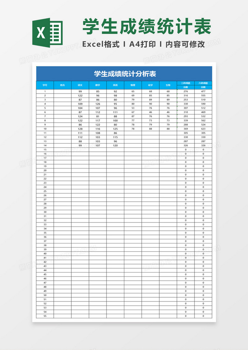 本作品为学生成绩统计分析表excel模板, 编号:016q743ke9, 格式为 xlsx, 大小1 MB, 本作品下载后,先解压,解压之后用推荐软件 Excel(2016) 打开, 然后进行编辑功能。
