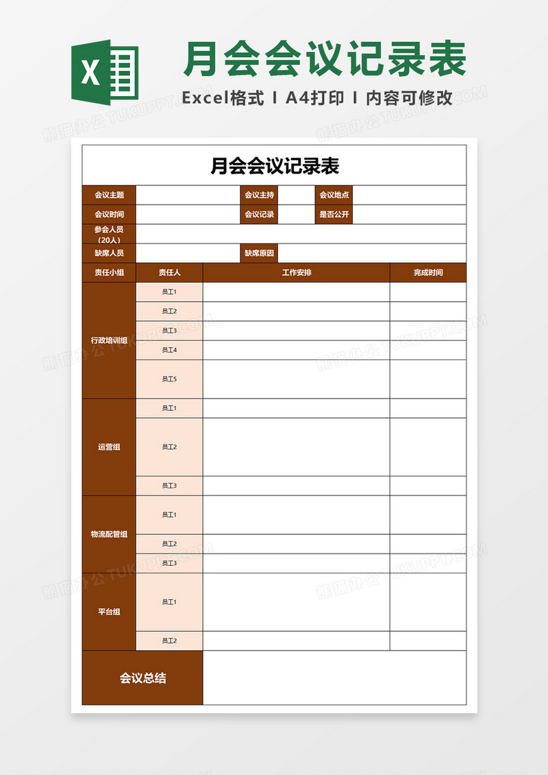 本作品为月会会议记录表Word模板, 编号:016qodlke9, 格式为 xlsx, 大小1 MB, 本作品下载后,先解压,解压之后用推荐软件 Excel() 打开, 然后进行编辑功能。
