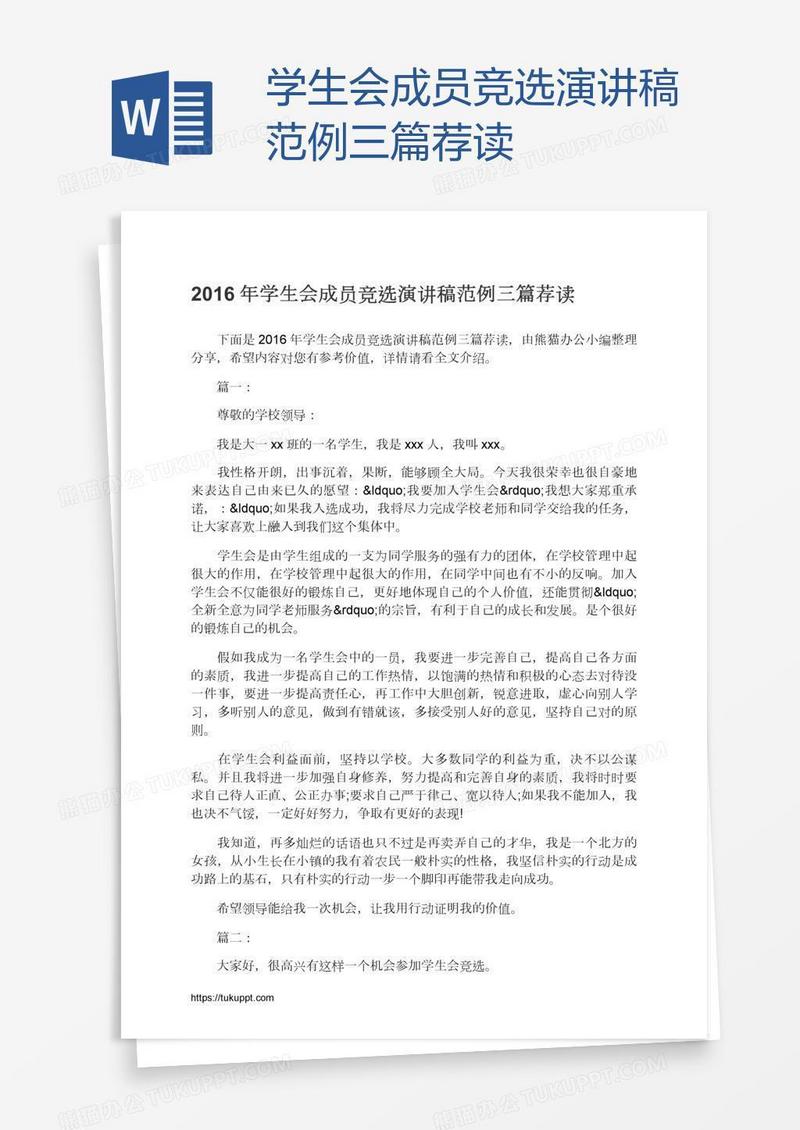 本作品为学生会成员竞选演讲稿范例三篇荐读, 编号:0ayk3rm5d9, 格式为 docx, 大小1 MB, 本作品下载后,先解压,解压之后用推荐软件 Word(2010) 打开, 然后进行编辑功能。