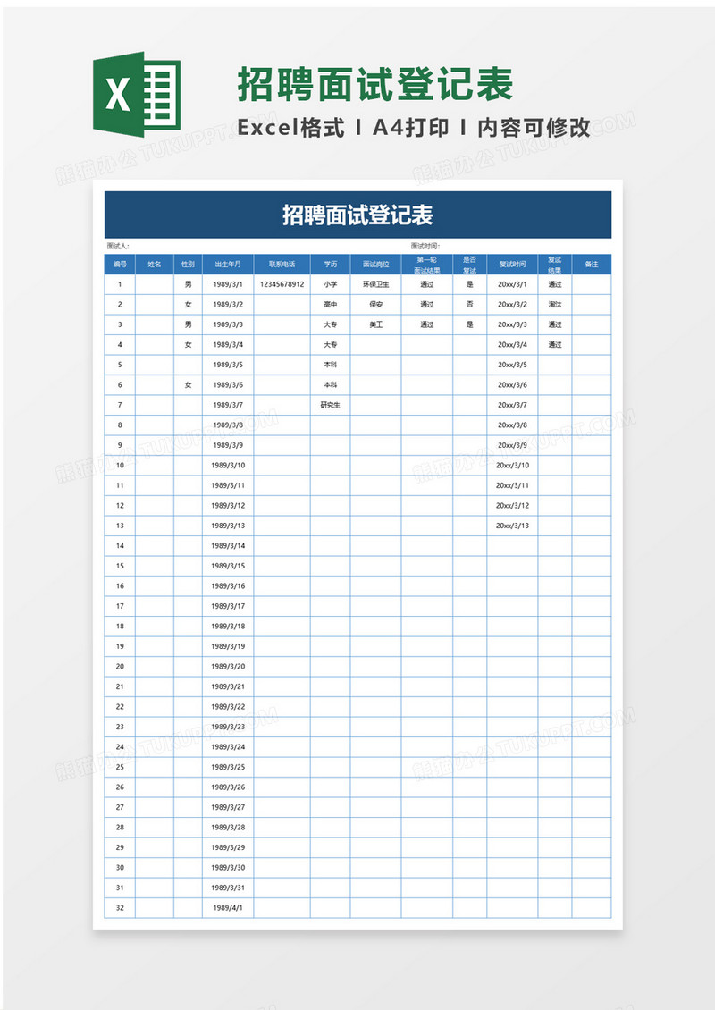 本作品为简单招聘面试登记表excel模板, 编号:510jobqw8a, 格式为 xlsx, 大小1 MB, 本作品下载后,先解压,解压之后用推荐软件 Excel(2016) 打开, 然后进行编辑功能。