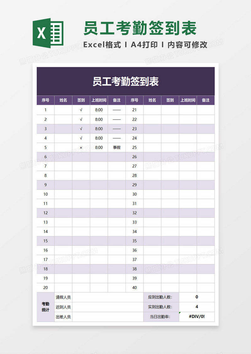 首页 > Excel模板 > 行政管理 > 签到表 >