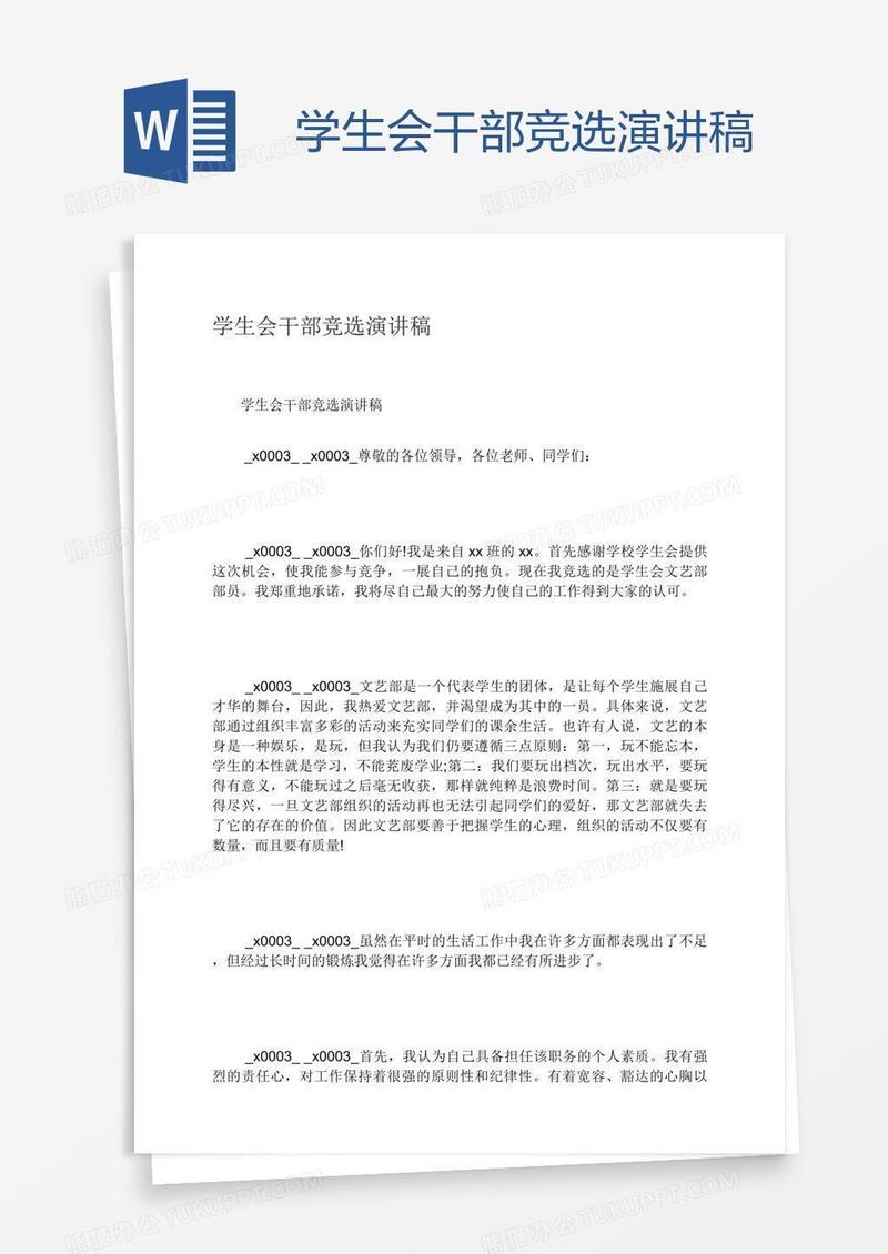 本作品为学生会干部竞选演讲稿, 编号:6187r3yoy9, 格式为 docx, 大小1 MB, 本作品下载后,先解压,解压之后用推荐软件 Word(2010) 打开, 然后进行编辑功能。