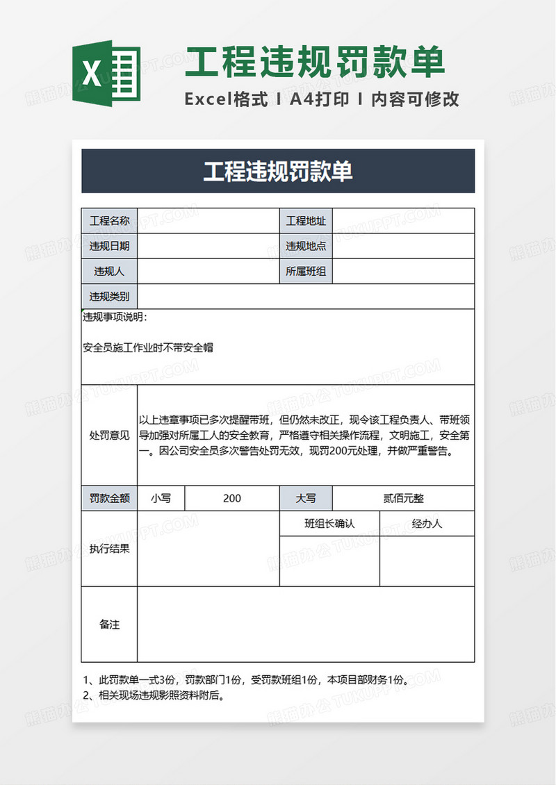 本作品为简单工程违规罚款单excel模板, 编号:71mdrkpqd1, 格式为 xlsx, 大小1 MB, 本作品下载后,先解压,解压之后用推荐软件 Excel(2016) 打开, 然后进行编辑功能。
