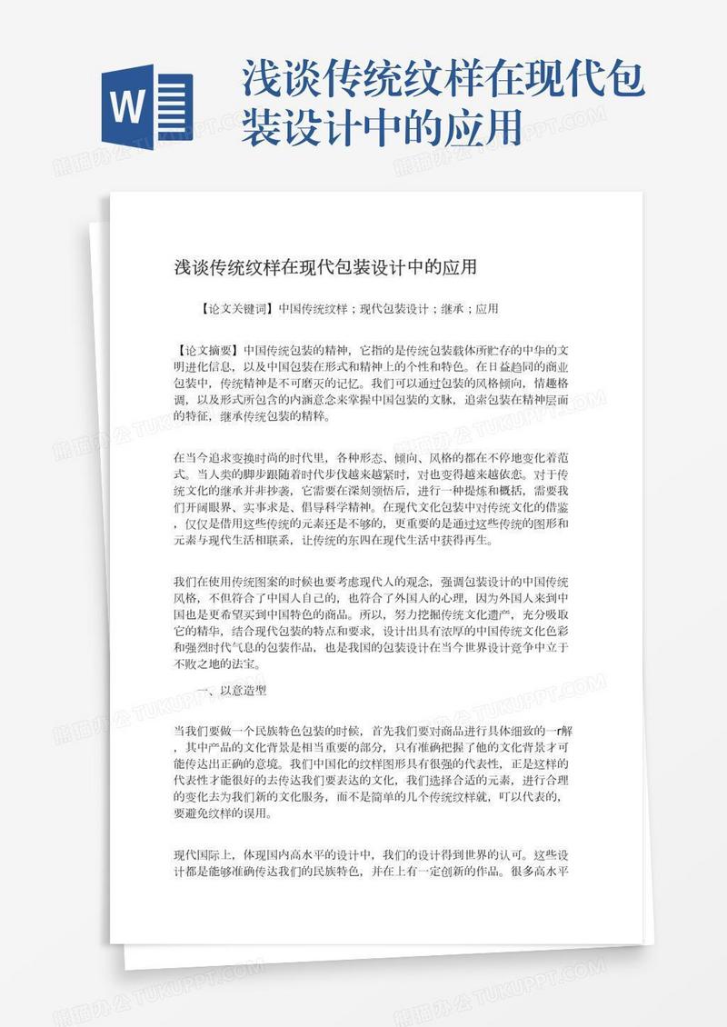 本作品为浅谈传统纹样在现代包装设计中的应用, 编号:b1qy6ymyr9, 格式为 docx, 大小1 MB, 本作品下载后,先解压,解压之后用推荐软件 Word(2010) 打开, 然后进行编辑功能。