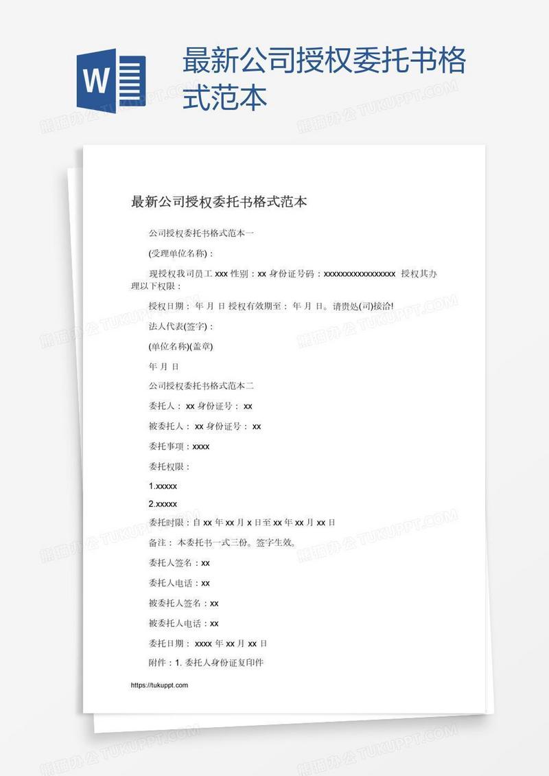 本作品为最新公司授权委托书格式范本, 编号:bad5wwkey9, 格式为 docx, 大小1 MB, 本作品下载后,先解压,解压之后用推荐软件 Word(2010) 打开, 然后进行编辑功能。