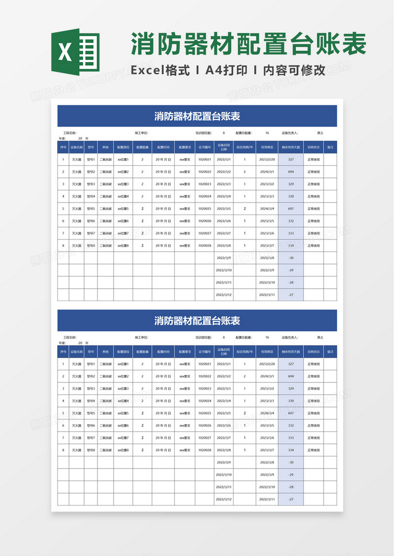 本作品为消防器材配置台账表excel模板, 编号:g9rv6peww1, 格式为 xlsx, 大小1 MB, 本作品下载后,先解压,解压之后用推荐软件 Excel(2016) 打开, 然后进行编辑功能。