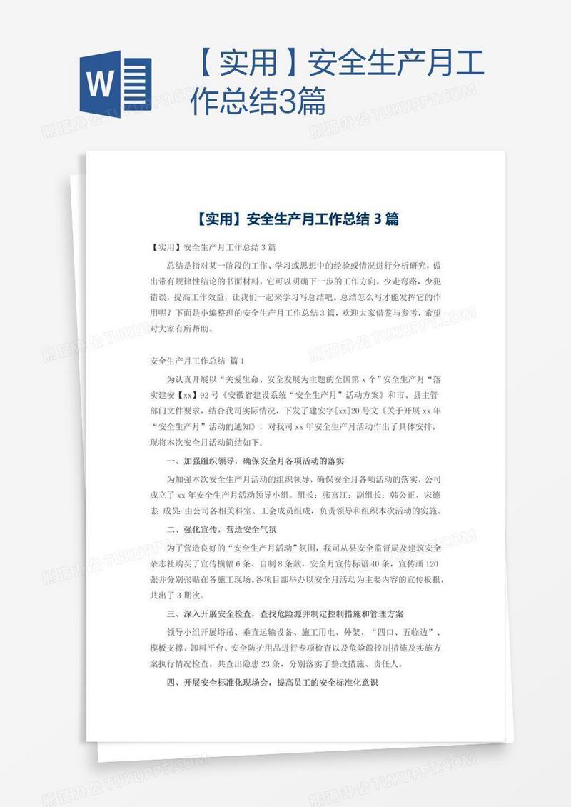 本作品为【实用】安全生产月工作总结3篇, 编号:g9rvb4qd31, 格式为 doc, 大小1 MB, 本作品下载后,先解压,解压之后用推荐软件 Word(2010) 打开, 然后进行编辑功能。