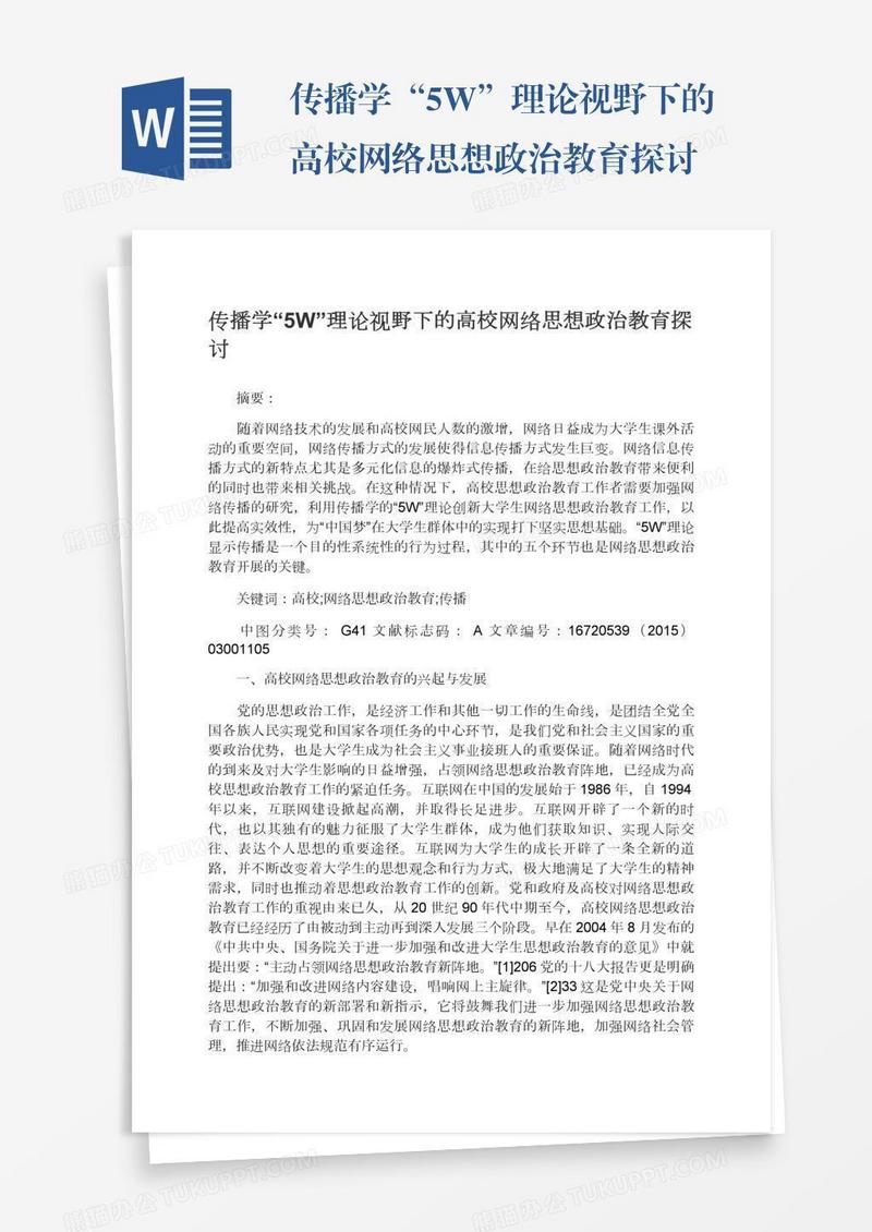 本作品为传播学“5W”理论视野下的高校网络思想政治教育探讨, 编号:k1b2keveb1, 格式为 docx, 大小1 MB, 本作品下载后,先解压,解压之后用推荐软件 Word(2010) 打开, 然后进行编辑功能。